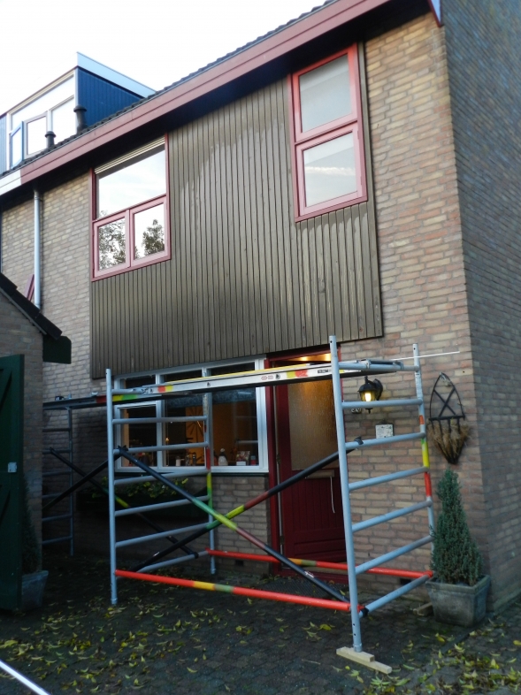 Gehele voorgevelrenovatie met nieuwe kunststof kozijnen, ramen, deuren en gevelbekleding.